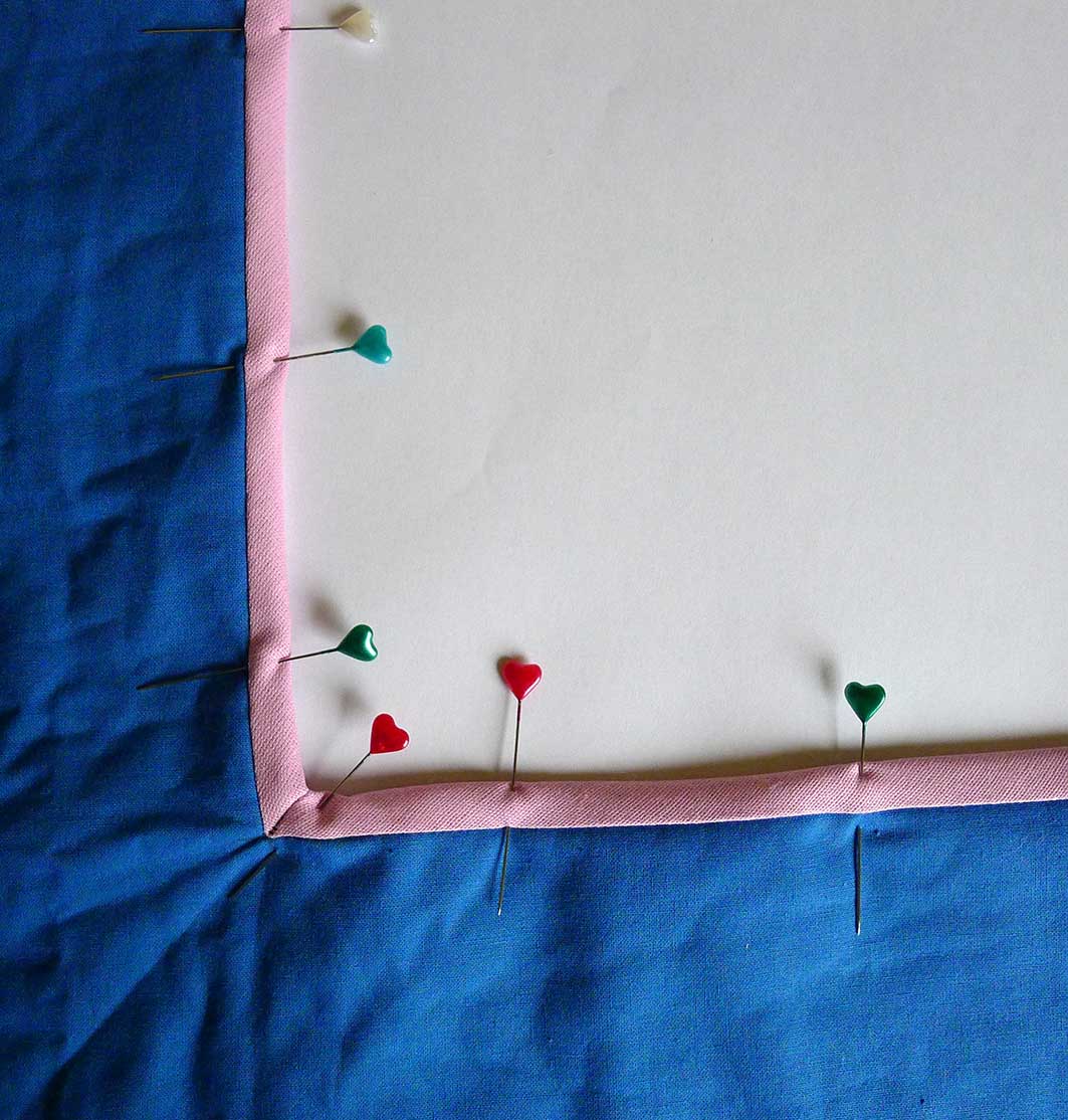 . Steck die Nadeln rechts fest kontrolliere aber dass auf der linken Seite die gerade gemachte Naht überdeckt wird. 1 mm neben der Kante fest. 7 cm vor der Ecke mit einer Stecknadel abstecken.